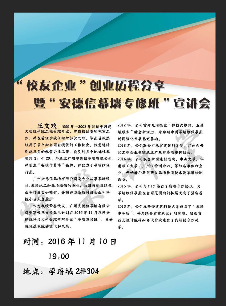 11月10日,在中國著名的“建筑老八校“之一的西安建筑科技大學(xué)學(xué)府城2#304,隆重舉行“安德信幕墻專修班”宣講會(huì)。安德信幕墻董事長王文歡先生在宣講會(huì)上做了主題演講。與大學(xué)生們交流、分享了既有幕墻的發(fā)展趨勢(shì)與前景。