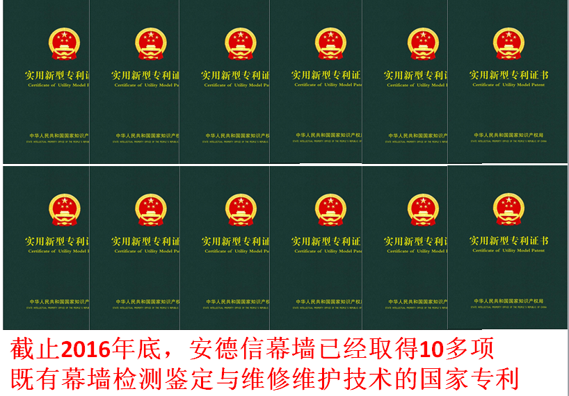 截止2016年12月,已經取得12項國家專利證書。這些專利技術廣泛應用于既有幕墻行業,以及新建幕墻的設計、建設過程中。