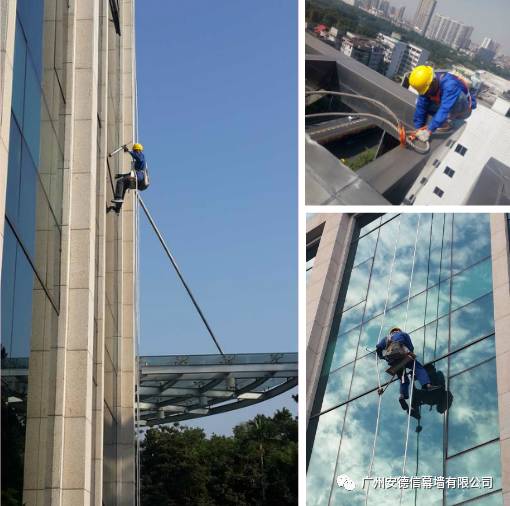 此照片拍攝于2016年12月15日,安德信幕墻員工在廣州某大廈進行補膠作業。