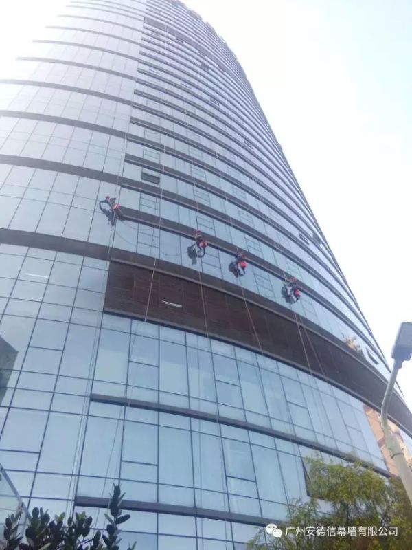 此照片拍攝于2016年12月19日,安德信幕墻員工正在對(duì)位于廣州的某省直單位的玻璃幕墻進(jìn)行保養(yǎng)維護(hù)。