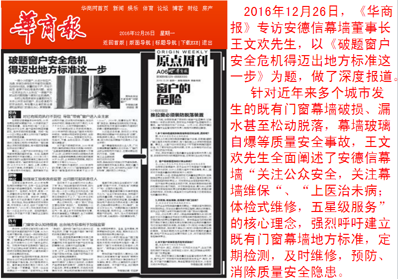 安德信幕墻董事長王文歡先生,就既有門窗幕墻質量安全問題,接受著名媒體《華商報》的專訪。