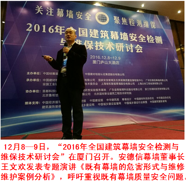 針對近年來多個城市發生的窗戶破損、漏水甚至松動脫落,幕墻玻璃自爆等質量安全事故,王文歡先生全面闡述了安德信幕墻“關注公眾安全,關注幕墻維保“、“上醫治未病;體檢式維修,五星級服務”的核心理念,強烈呼吁建立既有門窗幕墻地方標準,定期檢測,及時維修,預防、消除質量安全隱患。