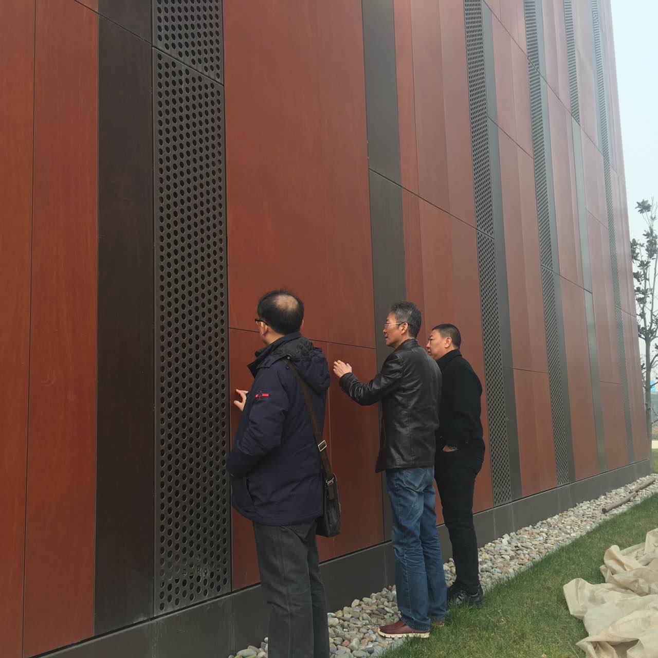 考察組站在該項目的“普若德木板幕墻”前面,饒有興趣地細心觸摸、認真查看。