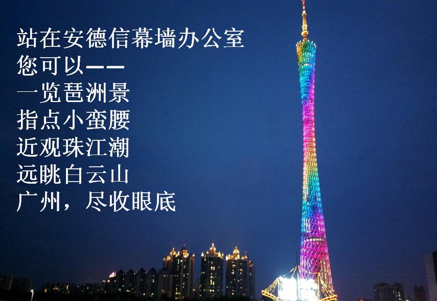 您可以站在安德信幕墻辦公室,一覽琶洲景,指點小蠻腰;近觀珠江潮,遠眺白云山。廣州,盡收眼底,了然于胸。 品嘗一杯清茶,切磋幕墻技術,交流行業(yè)信息,安德信幕墻真誠期待您的蒞臨!虛心向您學習!
