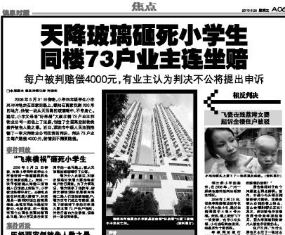 幕墻玻璃砸死小學生,73戶業主連帶賠償 2006年5月31日傍晚,深圳市XX區的小學四年級學生小宇興沖沖地走在回家的路上,哪知在離家僅剩200米的地方,他被一塊從天而降的玻璃砸中,不幸身亡。隨后,小宇父母將XX大廈北側73戶業主和物業公司一起告上了法庭。法院判決73戶業主每戶賠償4000元