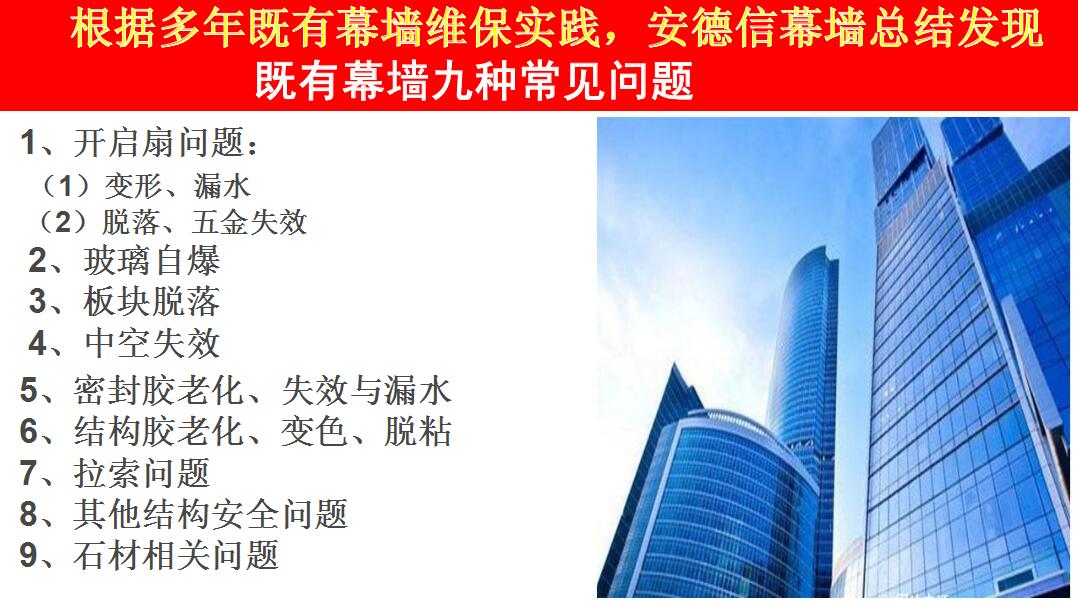 “老年幕墻”安全事故頻發,城實上空的“不定時炸彈” 我國的建筑幕墻目前大約12億平方米,大部分集中在北上廣深等大城市。有相當大一部分是上個世紀八九十年代修建。按照《建筑結構設計可靠性統一標準》,建筑幕墻的設計使用年限為25年。1991年以前建造的建筑幕墻都已經是“超齡服役的老年幕墻”。比如,1981年廣州交易會完成的第一個玻璃幕墻,1984年建造的北京長城飯店玻璃幕墻,1986年建造的我國第一個全隱框玻璃幕墻深圳發展中心大廈,都已有30年以上歷史。 根據自然規律,老年人往往各種疾病多發、高發、頻發,“老年幕墻”的質量安全狀況也是如此。著名幕墻專家、安德信幕墻董事長王文歡先生形象地指出,它們就像一顆顆“不定時炸彈”高懸在城市的上空,不知道什么時間“爆炸”,其破壞力與心理影響,甚至比夠預知時間的“定時炸彈”更可怕! 根據《中國門窗幕墻行業技術及市場分析報告》披露(杜繼予編著,中國建材工業出版社出版):深圳市近期對25年以上既有幕墻安全狀況的調查發現,近30%的幕墻發生開啟扇整體脫落的現象,特別是在臺風季節,出現的現象更為嚴重,有的幕墻幾乎每年都有開啟扇脫落的現象。 說起幕墻物業安全隱患,很多人可能只知道玻璃自爆、開啟扇掉落等比較“震撼”的問題,其實,幕墻物業安全隱患涉及到多個方面。 近些年來,安德信幕墻與北京、廣州、成都、廈門、西安等省市的物業管理協會合作,對包括機場、高鐵站、星級酒店、高檔寫字樓、商業綜合體、居民小區在內的多個幕墻建筑,進行實地勘察與安全隱患的檢測鑒定與維修維護,安德信幕墻總結發現其安全隱患主要有九大種類: 一、開啟扇變形、漏水、脫落; 二、玻璃自爆; 三、板塊(玻璃、石材、鋁板等)脫落: 四、中空玻璃失效(影響建筑外觀、能耗增大,使業主經濟利益受損) 五、密封膠老化、失效與漏水; 六、結構膠老化、變色、脫粘; 七、拉索問題(幕墻建筑內部受力失衡引發。造成其他一些拉索受力的不正常增大,最終引起桿件變形,拉索超載,存在較大安全隱患); 八、其他結構安全問題(埋件問題、主龍骨連接及主次龍骨連接問題、鋼鋁結合中鋼和鋁互相配合連接問題,以及最容易出現的銹蝕問題) 九、幕墻石材破裂、掉落等。