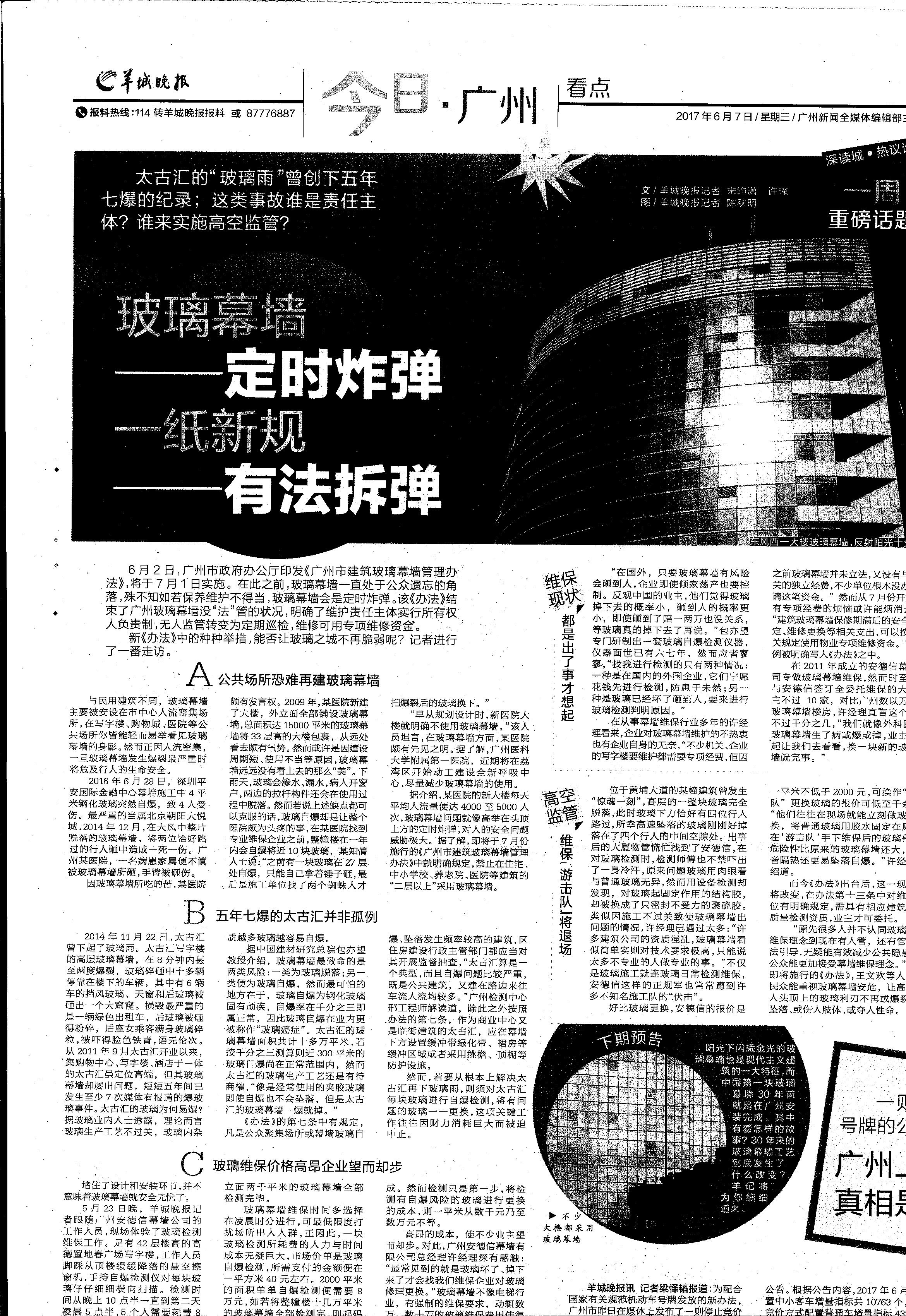 ——本文刊登于《羊城晚報》2017年6月7日,記者:宋昀瀟 許琛采寫。原標題:維護不得當玻璃幕墻會是定時炸彈,一紙新規有法拆彈。現標題是編者所加。
