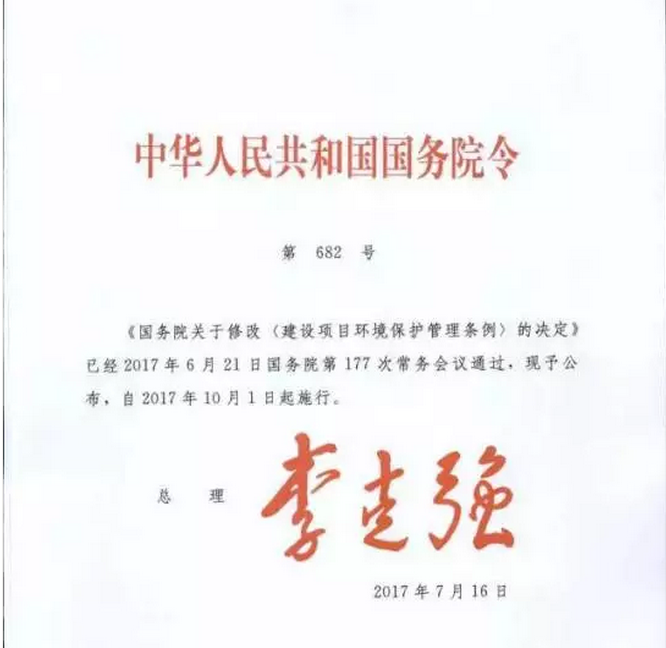 近日,國務院頒布第682號令,對《建設項目環境保護管理條例》進行了修改。自2017年10月1日起施行。