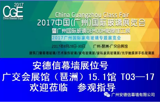 歡迎免費索取展會門票 ,先來先得,送完為止。 聯系人:李友琴(手機:18933910453) 安德信幕墻展位號:廣交會(琶洲)15.1館 T03—17 8月28—30日,我們不見不散! |