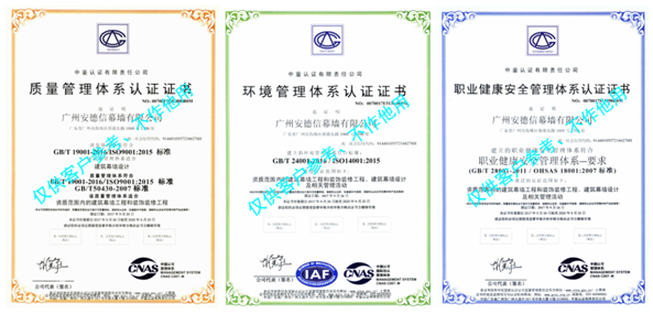 2017年9月,通過公司各部門的積極努力和全力配合,安德信幕墻取得了“質量管理體系認證書,環境管理體系認證書,職業健康安全管理體系認證書”,成為中國既有幕墻維保行業首家三標一體認證企業,標志著我司在管理規范化上邁入了新的高度,積極與國際化標準接軌,盡量提高企業的整體競爭力。