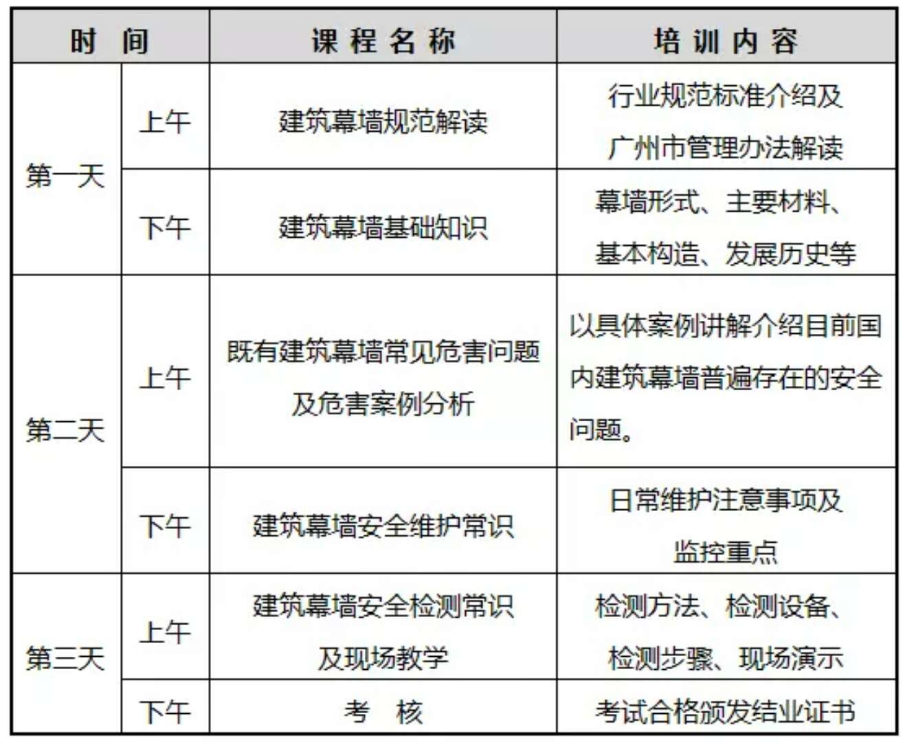 既有建筑幕墻安全管理專題班培訓(xùn)通知根據(jù)廣州市物業(yè)管理行業(yè)協(xié)會穗物協(xié)通〔2018〕36 號文件精神,為了深入貫徹《廣州市建筑玻璃幕墻管理辦法》(市政府令第148號,2017年7月1日起施行),以及建設(shè)部、廣東省關(guān)于既有建筑玻璃幕墻管理的相關(guān)法規(guī)、政策和關(guān)于指定人員、加強學(xué)習(xí)的要求,廣州市物業(yè)管理行業(yè)協(xié)會決定組織舉辦既有建筑幕墻安全管理專題培訓(xùn)。相關(guān)事宜如下: