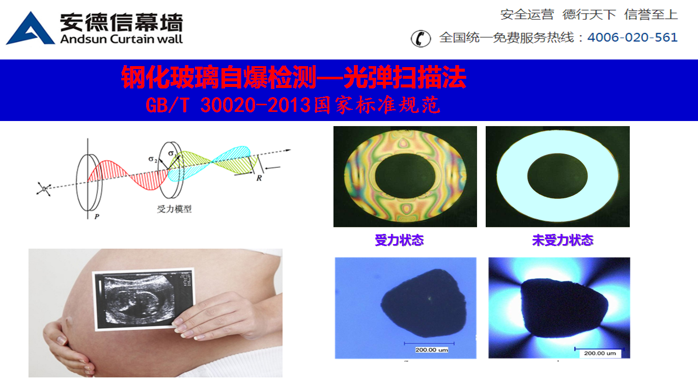 按照國家住建部有關規定,幕墻玻璃都應該使用鋼化玻璃,引起鋼化玻璃自爆的原因很多很復雜:原料品質、原片生產、加工切割、鋼化加熱、風冷降溫、設計不當、安裝不當、維護不當、溫度異常、異質顆粒…… 光彈掃描法,能夠檢測玻璃內應力集中和缺陷。已廣泛應用于建筑玻璃(比如玻璃幕墻、門窗玻璃)安全及各種鋼化玻璃安全檢測。可以找出幕墻玻璃的自爆源,提前做好維修維護,有效預防幕墻”玻璃雨“ 我國的多個重大會議召開之前,比如金磚會議,國家有關部門要求國檢集團對各國政要居住的樓房門窗玻璃、玻璃幕墻進行質量安全檢測。至于參與的各類工業建筑、民用建筑的玻璃幕墻檢測,更是數不勝數.