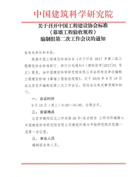 2019年9月18日,來自全國各地的幕墻行業專家學者,資深行業人士,集聚在中國建筑科學研究院,參加中國工程建設協會標準《幕墻工程驗收規程》編制組第二次工作會議。