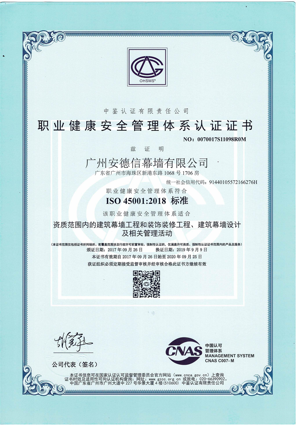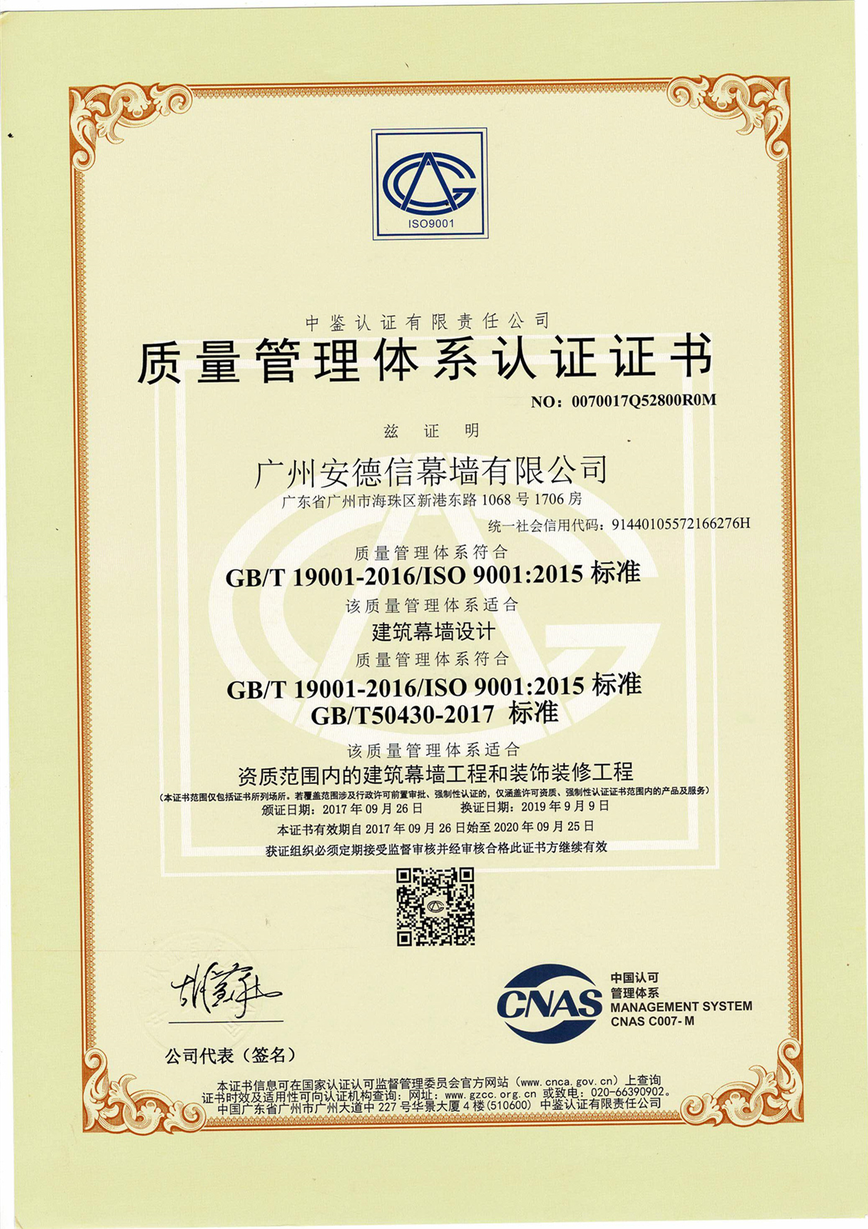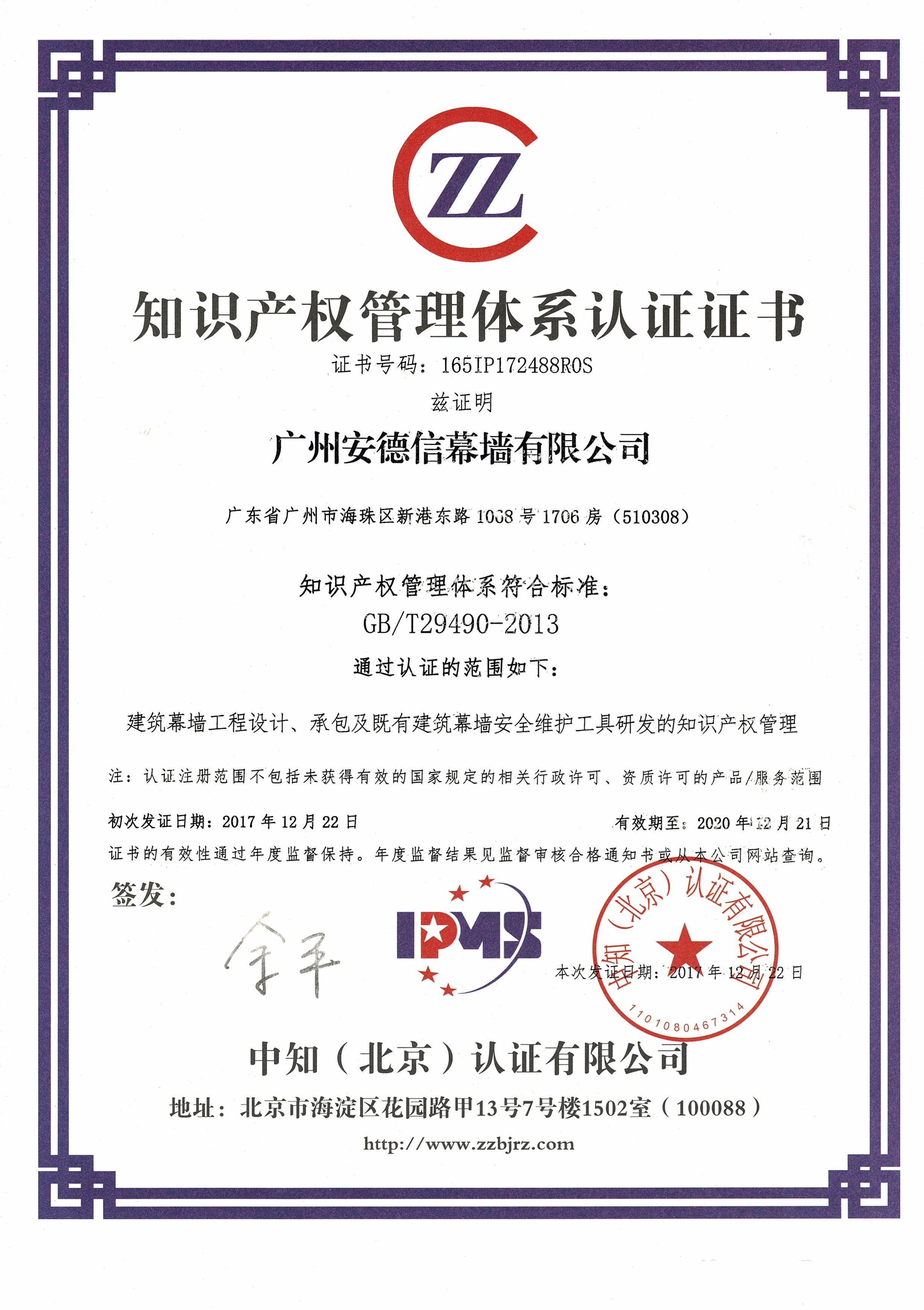 安德信幕墻,高度重視公司管理體系建設,通過“四標認證”——ISO 9001 質量管理體系認證、ISO14001環境管理體系認證、ISO 45001職業健康安全管理體系認證、GB/T29490知識產權管理體系認證。