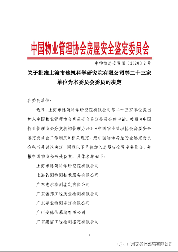 文件顯示,安德信幕墻是此次被批準成為中國物業管理協會房屋安全鑒定委員會委員的二十三家單位的其中之一。