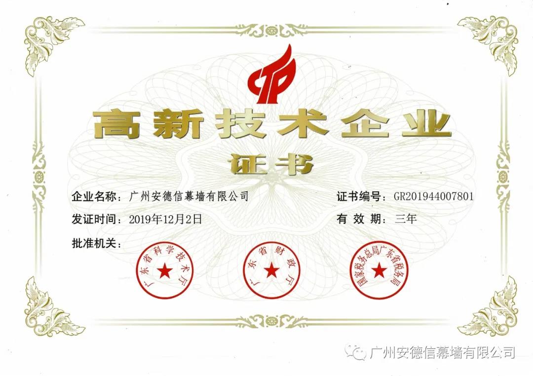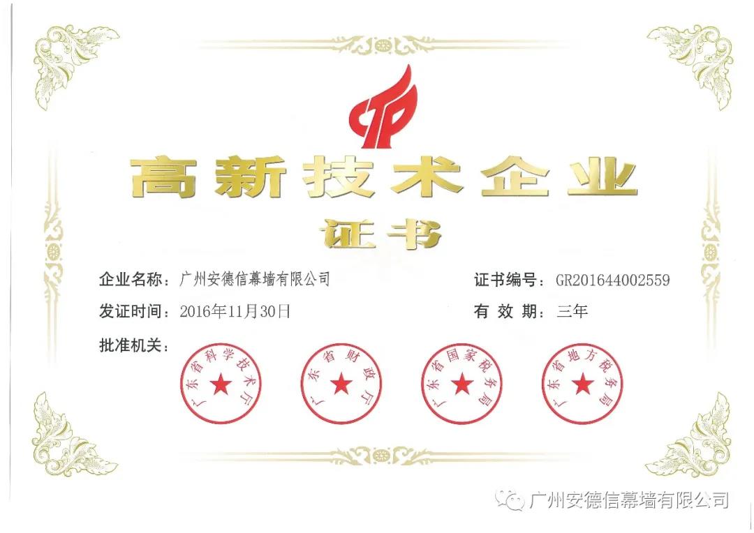 這是安德信幕墻第二次獲此殊榮。此前的2019年6月,榮獲《2018年度廣東省守合同重信用企業》證書。 近些年來,安德信幕墻在企業管理體系建設、科技研發、幕墻標準規范編寫、市場拓展等方面持續發力,取得了一定成績: 1、2016年、2019年兩次榮獲《高新技術企業證書》;