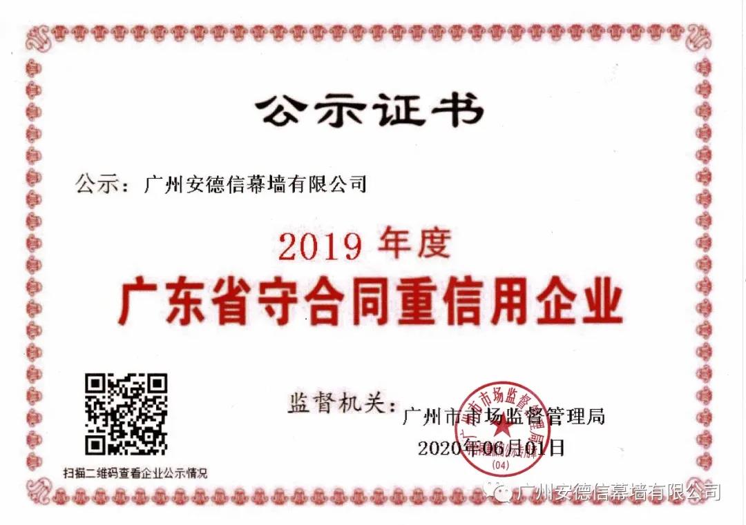 近日,廣州安德信幕墻有限公司榮獲《2019年度廣東省守合同重信用企業》證書。證書通過評審、公示等環節,由廣州市市場監督管理局頒發。