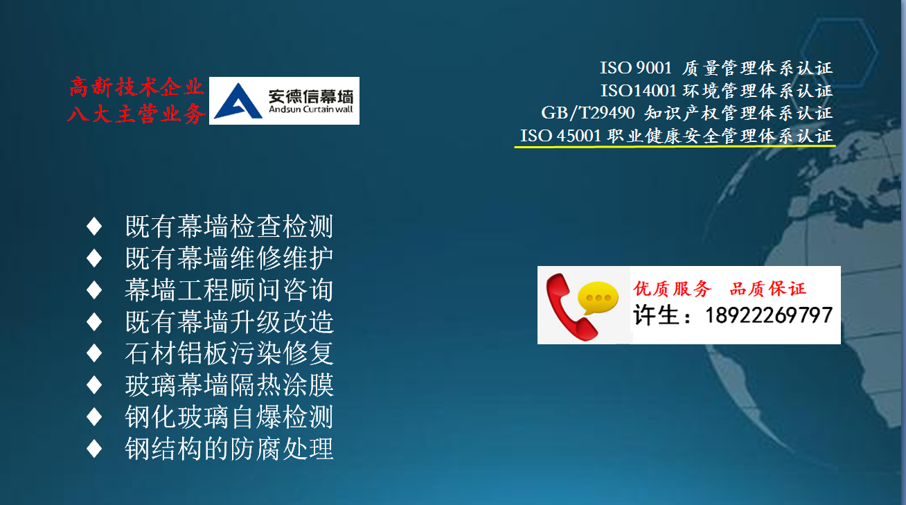 安德信幕墻的成長與發展,離不開各位領導、專家學者、相關單位以及墻業主的大力支持。感謝有您一路相伴,感恩您的鼓勵支持。 學習不停頓,前進不止步。安德信幕墻將一如既往的專注既有幕墻檢查檢測與維修維護,努力研發幕墻檢測維保新技術,嚴格遵守幕墻標準規范,堅守“上醫治未病、體檢式維修、五星級服務”的幕墻檢測維保理念,愿做謹小慎微、精益求精的“幕墻工匠”,為客戶提供優質服務,為既有幕墻的安全管理盡綿薄之力。