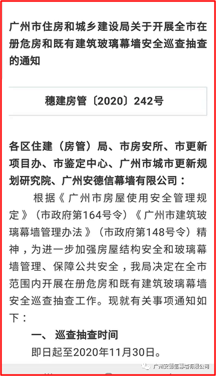 2020年8月18日,廣州市住房和城鄉建設局發布穗建房管〔2020〕242號文件——《關于開展全市在冊危房和既有建筑玻璃幕墻安全巡查抽查的通知》。