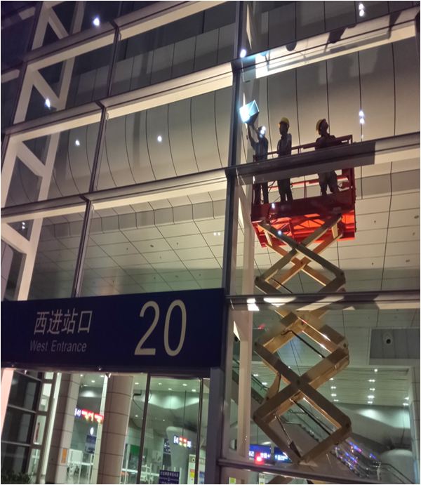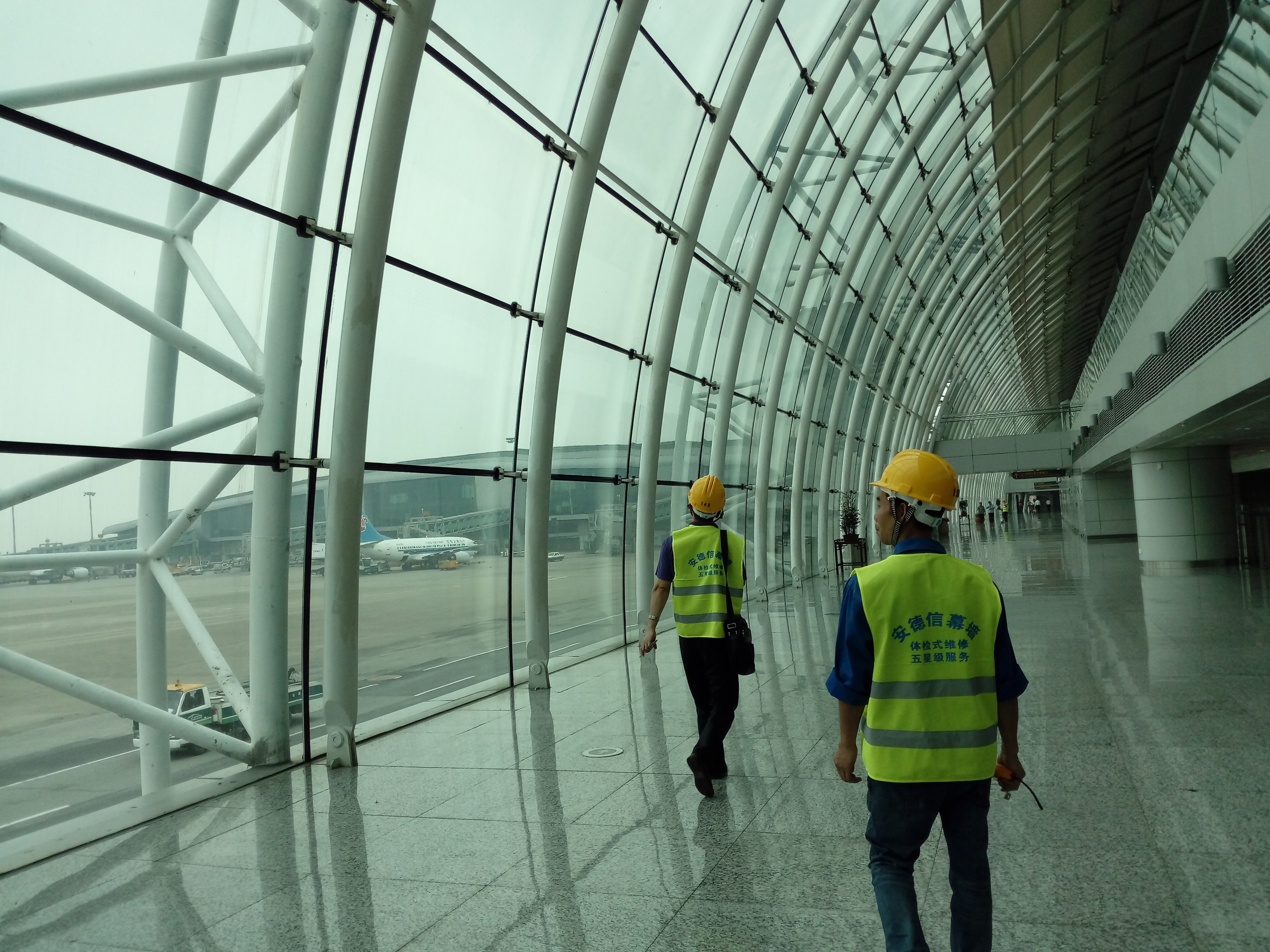 安德信幕墻技術人員,在某機場、某高鐵站進行玻璃幕墻光彈掃描、檢查巡查。