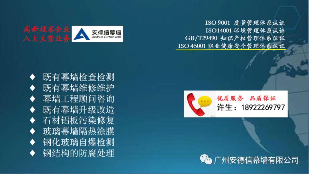 安德信幕墻將不忘初心,謹小慎微,行穩致遠,一如既往地致力于既有幕墻檢測檢查與維修維護。期待在即將到來2021年,也是公司成立10周年的喜慶日子,爭取更加靚麗的業績。
