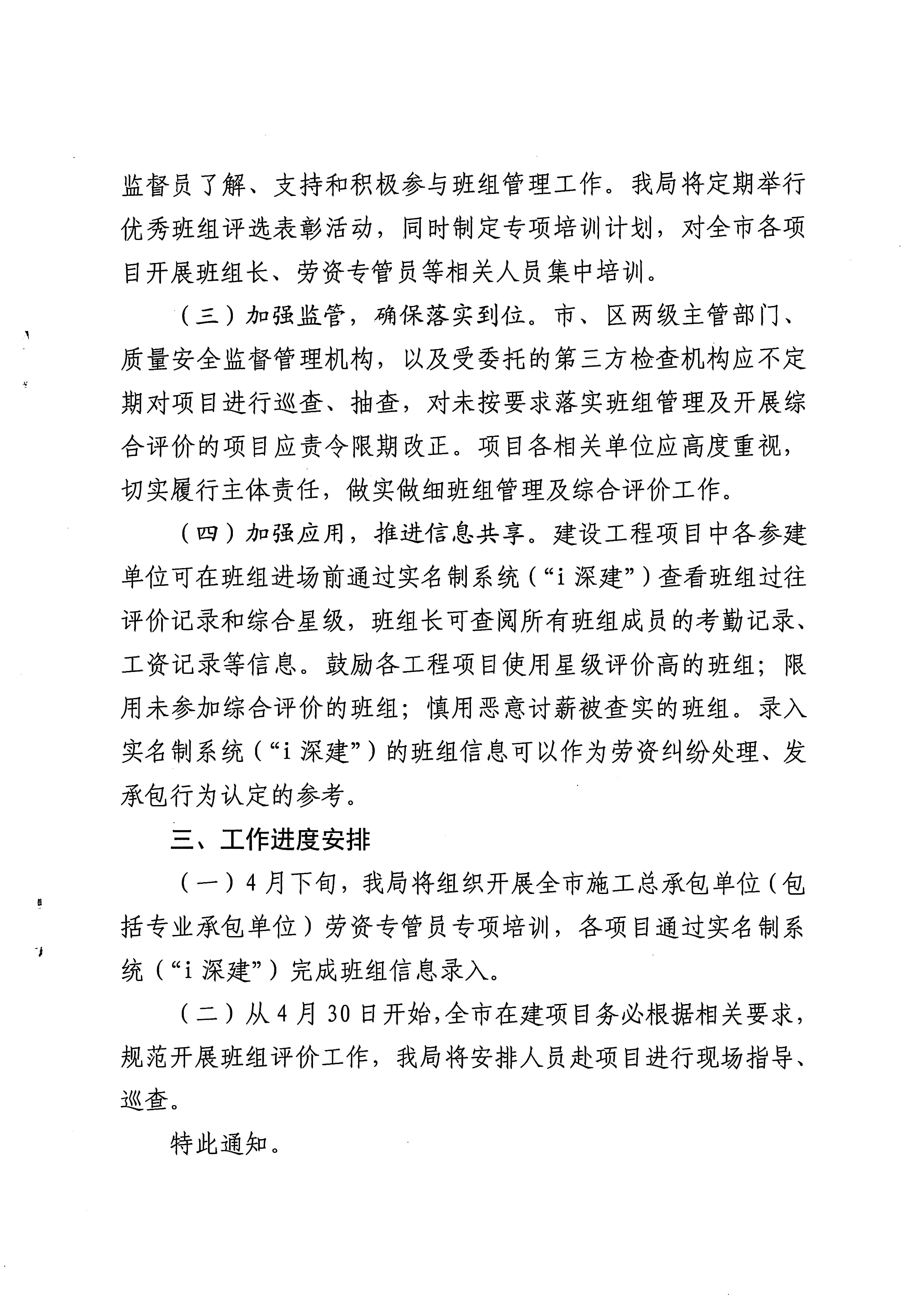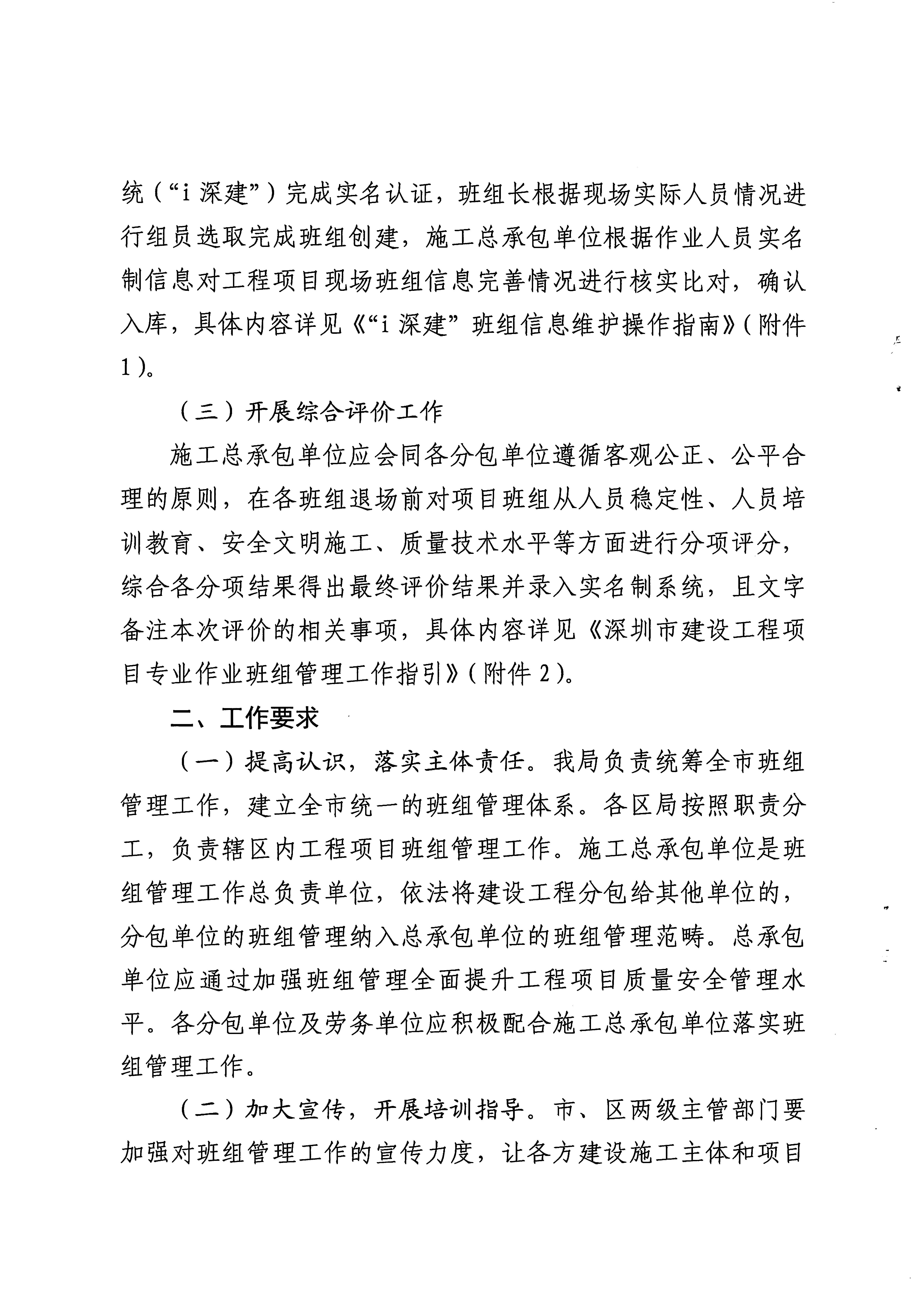 2021年4月20日,深圳市住房和建設(shè)局發(fā)布《關(guān)于進(jìn)一步做好建設(shè)工程項(xiàng)目專業(yè)作業(yè)班組管理工作的通知》,旨在提升工程質(zhì)量安全水平,推動(dòng)建筑市場(chǎng)信用體系建設(shè)和行業(yè)用工改革,預(yù)防和減少勞資糾紛,進(jìn)一步加強(qiáng)和完善建設(shè)工程項(xiàng)目專業(yè)作業(yè)班組管理工作。