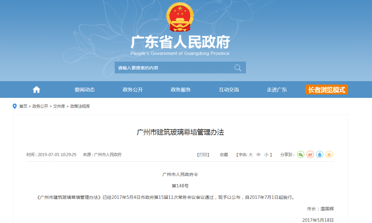 建筑玻璃幕墻的安全管理作為城市安全管理的重要環節,在維護城市繁榮穩定,保持社會安定團結中有著不可替代的作用。廣州市政府高度重視建筑玻璃幕墻的安全問題,為加強市內建筑玻璃幕墻的管理和維護,保障公共安全,于2017年7月1日起實施《廣州市建筑玻璃幕墻管理辦法》,明確既有幕墻安全監管的部門及職責,使政府對幕墻安全的監管工作常態化。