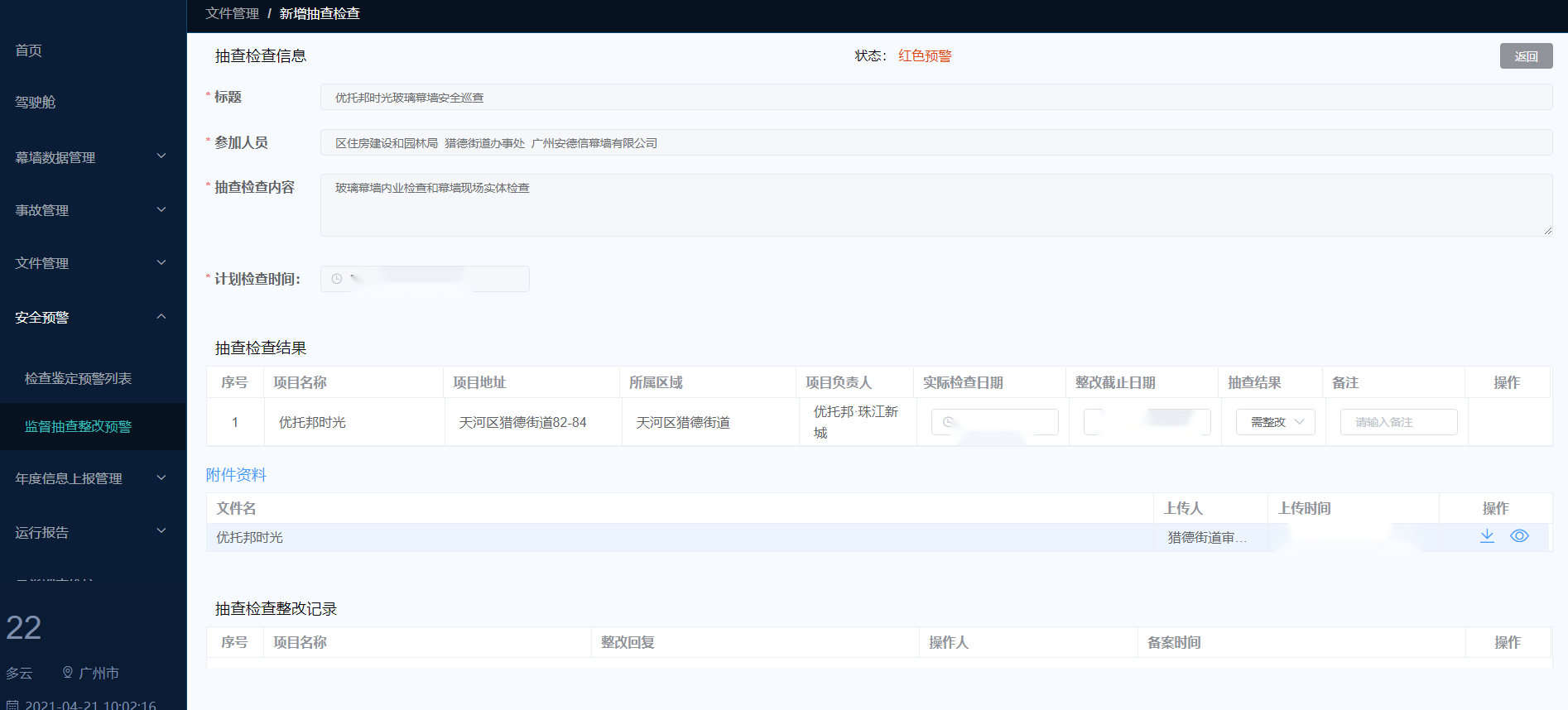 天河區擁有東塔、西塔、省博物館、音樂廳等廣州標志性建筑,也是廣州市既有建筑玻璃幕墻面積保有量最大,數量最多、超高層建筑最多的區。在廣州市持續開展的建筑玻璃幕墻安全管理部署中,住房與城鄉建設局給予了重點關注與支持,局各級領導多次帶隊到天河區重點項目現場考察,指導檢查建筑玻璃安全管理工作的開展落實情況。 天河區在既有幕墻安全管理工作中不斷探索積極創新,率先使用云計算數字化《既有幕墻安全監管平臺系統》開展既有玻璃幕墻的全面安全管理,梳理規范全區既有玻璃幕墻基礎數據信息,規范建筑玻璃幕墻的安全管理,貫徹落實《廣州市建筑玻璃幕墻管理辦法》。并投入專項資金,持續開展既有玻璃安全巡查檢查、政策宣貫、技術服務與業務培訓工作,在加強監管的同時,為既有玻璃幕墻安全責任人提供更加全面的技術支持。 3月7日,天河區2022年度建筑玻璃幕墻安全巡查工作正式啟動。廣州安德信幕墻有限公司作為天河區住房建設和園林局聘請的專業技術服務單位,協助職能部門檢查巡查玻璃幕墻維護責任主體日常巡查、定期檢查檢測、安全性鑒定、維護保養工作的開展情況,宣貫玻璃幕墻安全管理法律法規、檢查維護知識,為建筑維護管理單位提供專業技術咨詢服務,指導責任人排查建筑幕墻安全隱患降低安全風險。