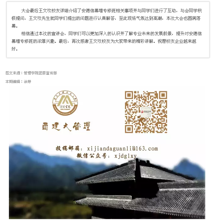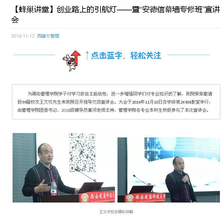 說明:本文(含標題)轉載于西安建筑科技大學管理學院2016年11月11日的官方微信。本文插圖為其官方微信截圖。為閱讀方便,轉載時采用藍色字 為調動管理學院學子對學習的自主能動性,進一步增強同學們對專業知識的了解,我院榮幸邀請到99屆校友王文歡先生來我院召開指導交流宣講會。大會于2016年11月10日在學府城2#304教室舉行,由管理學院團委書記、2016級輔導員黃河老師主持,管理學院各專業本科生積極參與了本次宣講會。