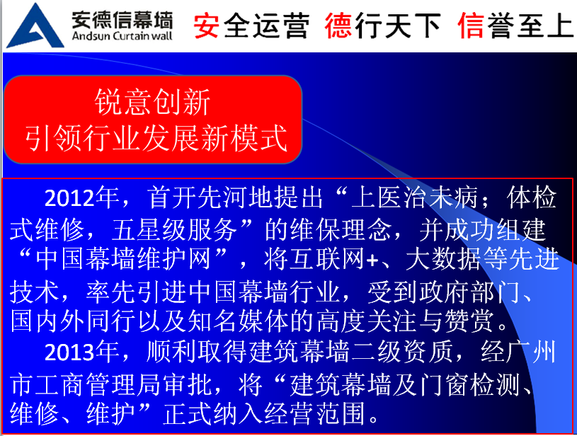 玻璃幕墻應該強制檢測 為解決問題,成都進行了嘗試。該市相關部門在汛期到來前后,會發放通知督促相關業主加強檢查并組織安全排查;要求人員密集的商業中心等,在玻璃幕墻下方周邊區域合理設置綠化帶等區域隔離人群,或采用挑檐、防沖擊雨篷等防護設施。 從長遠看,省金屬結構行業協會專家組組長孫巖認為相關部門應出臺政策,要求對到期或即將到期玻璃幕墻進行強制檢測,“就像對到年限汽車進行強制年檢一樣。” 安德信幕墻觀點:國家有關部門以及地方政府部門,陸續出臺政策法規,對既有幕墻特別是玻璃幕墻采用一定的“限制”措施,是出于公共安全以及節能環保等方面的考慮。 對“老齡”幕墻的檢測鑒定與維修維護,國家也有相應的政策法規,但是,部分業主單位認識不足、重視不夠,沒有按規定定期檢測。殊不知,幕墻隱患就像一顆“不定時炸彈”,對公共安全形成潛在威脅。近些年,國內已經因此導致多起人員傷亡、車輛損毀事件,值得我們警醒與深思。 既有幕墻行業的專家學者,具有豐富的專業知識與經驗,應該積極發揮自己的影響力,大力呼吁、推動社會各界對國家相關政策法規的認真執行,特別是要將“定期檢測鑒定、及時維修維護”落實到實處,盡早化解風險,將問題消除在萌芽狀態,促進既有幕墻行業健康有序的發展,確保公眾安全。