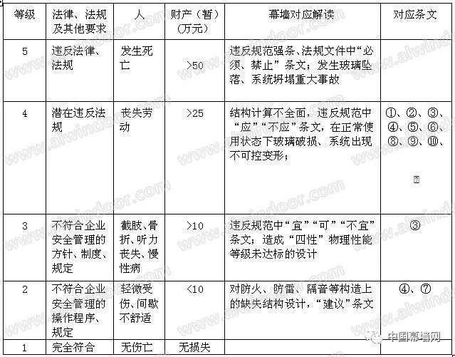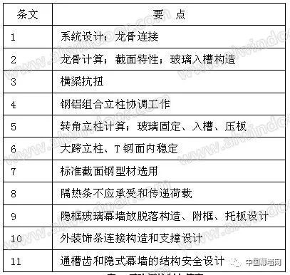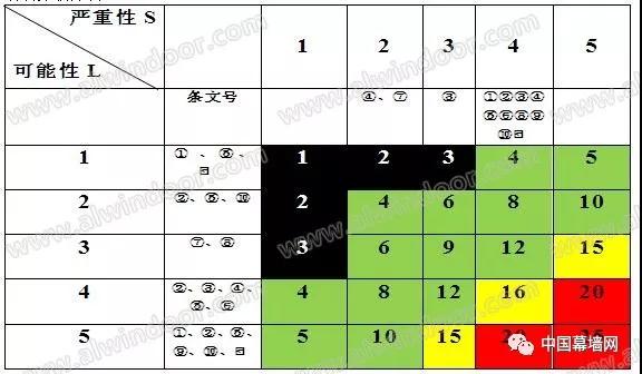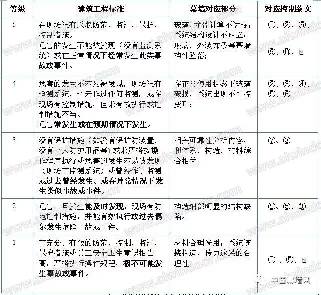 表2 風險矩陣示例 分級評分和矩陣可以用定量等級進行建立。例如,在可靠性背景中,可能性等級表示指示故障率,而結果等級表示故障的現金成本。工具的使用需要有掌握相關專業知識的人員(最好是團隊),以及有助于對結果和可能性進行判斷的現有數據。 5.2 過程 為了進行風險分級,使用者首先要發現最適合當時情況的結果描述符,然后界定那些結果發生的可能性。然后,從矩陣中讀取風險等級。很多風險事項會有各種結果,并有各種不同的相關可能性。通常,次要問題比災難更為常見。因此,有必要選擇是對最常見的問題評分,還是對最嚴重的結果,抑或是兩者的統一體進行評分。在很多情況下,有必要關注最嚴重的可信事項,因為這些事項會帶來最大的威脅,經常也是管理者最關注的事情。有時,有必要將常見問題和不可能的災難歸為獨立風險。關鍵是要使用與所選結果相關的可能性,而不是整個事項的可能性。 矩陣定義的風險水平可能與是否應對風險的決策規則相聯系。 5.3 輸出 輸出結果是對各類風險的分級或是確定了重要性水平的、經分級的風險清單。 5.4 優缺點 優點包括:比較便于使用;將風險很快劃分為不同的重要性水平。 局限包括:必須設計出適合具體情況的矩陣,因此,很難有一個適用于組織各相關環境的通用系統;很難清晰地界定等級;使用具有很強的主觀色彩,分級者之間會有明顯的差別;無法對風險進行總計(例如,人們無法確定一定數量的低風險或是界定過一定次數的低風險相當于中級風險)。組合或比較不同類型后果的風險等級是困難的。 結果將取決于分析的詳細程度,即分析越詳細,情景數字就越高,每個數字的概率越低。這將低估實際風險等級。在描述風險時將情景分組的方法應當在研究開始時確定并且是一致的。 6 矩陣法分析應用 以上海市建筑幕墻工程技術規范為風險識別原則,以上海市建委科技委有關《上海市建筑玻璃幕墻結構安全論證評審要點》為識別點,針對構件式玻璃幕墻部分風險評價方法進行舉例。 6.1 對風險源的采集和梳理 審查要點[2]如下: 1) 構件式幕墻系統設計應安全合理、施工可行;立柱、橫梁連接構造應可靠、可行,并符合結構傳力要求。 2) 系統主型材立柱、橫梁的強度和剛度應滿足規范要求;橫梁、立柱最小截面厚度及其截面寬厚比應符合規范要求。玻璃入槽及邊距尺寸應符合規范規定。 3) 橫梁截面設計應能滿足玻璃面板偏心荷載作用下的抗扭承載能力,無詳細計算分析和可靠構造措施橫梁不宜采用單壁開口型材。 4) 采用鋼鋁組合截面立柱,鋼鋁連接構造應能滿足共同協調工作的要求,鋼鋁共同工作的組合截面立柱強度和剛度應滿足規范要求。不建議大量采用鋼鋁組合立柱形式,確需采用時,建議以鋼立柱為主受力構件,鋁型材作為裝飾,且其連接構造應確保荷載能直接傳至于鋼構件。 5) 轉角立柱應關注其強度及剛度是否滿足安全性要求,弱軸方向的強度應有驗算;轉角部位玻璃的固定方式應可行,玻璃入槽深度應滿足要求,玻璃壓板或扣板連接應可靠。 6) 對大跨度立柱,應考慮大彎矩作用平面內的穩定性能否滿足安全性要求;對于采用T 型鋼立柱,應審核其側向穩定性是否滿足要求。 7) 立柱、橫梁采用鋼結構構件時,應盡可能選用國家標準鋼型材截面,不建議采用焊接鋼板或厚鋼板形式的立柱、橫梁。 8) 立柱、橫梁采用隔熱型材時,隔熱條不應承受和傳遞荷載,采用穿條擠壓型斷熱條時,主型材材料的選用應考慮擠壓工藝的影響。 9) 隱框玻璃幕墻系統應有防玻璃脫落的構造措施,確保滿足安全性要求;玻璃副框設計的可行性和可靠性應符合結構受力和安全要求;玻璃托板及其連接應經計算,應檢查連接位置和連接方式的合理性和可靠性,托板應與橫梁采用機械連接。 10) 外挑裝飾條應仔細審核其連接構造和支承節點能否滿足安全性要求。大尺度懸挑外裝飾線條設計應構造合理、連接可靠、傳力清晰、施工工藝可行,不建議采用過多的轉接連接。 11) 對于采用通槽齒型材或隱槽式固定方式的構件式幕墻系統,應提供足夠的安全措施。 針對要點進行關鍵控制點梳理如下表3.